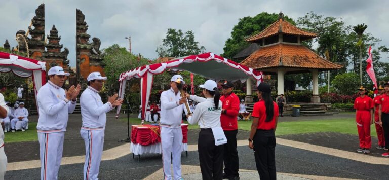 Badung, Kontingen Kabupaten Badung menerima Api Obor Pekan Olahraga Provinsi (Porprov) Bali XVI 2025 yang diserahkan oleh kontingen Kabupaten Tabanan,...